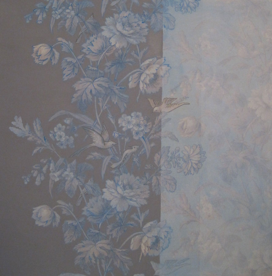 I’ve also realized that I really don’t care for working on fabric or canvas (too much give), I detest the plasticity of acrylic, and foreshortening is tricky when juxtaposing flattened parallel (to the wall) patterns. (This works in my drawings but does not feel right in this work.)