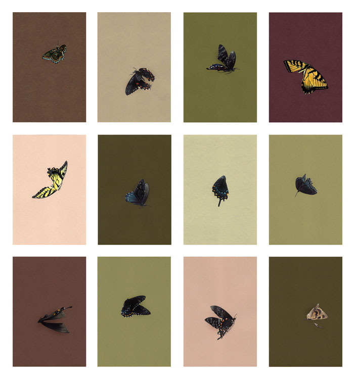 One of our visiting professors suggested that I juxtapose some sort of harsher element (like gravel) with the butterflies in Casualties so that the fact that these insects are “road kill” is more clearly communicated. Additionally, the extent to which I use multiples was questioned – how many individual pieces are necessary? (More thought needed in order to answer this but my instinct says that multiples are good, especially in light that they create a type of pattern on their own.)