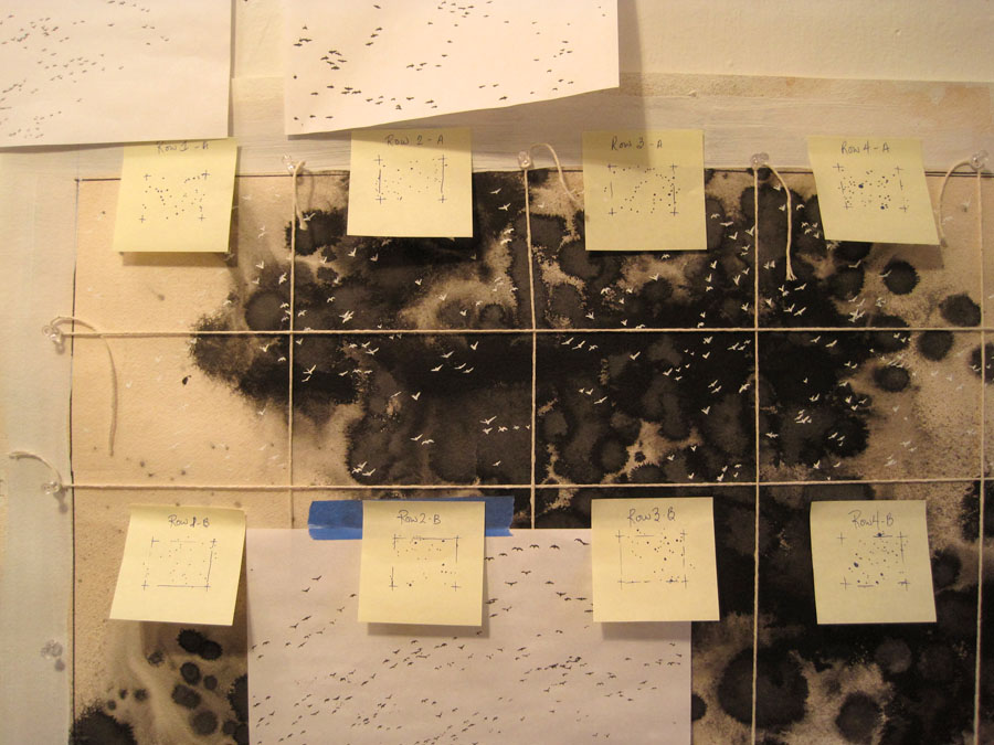 I brought about half of the pieces I’ve been working on lately, which meant I had a lot of work up. The piece that got the most response was the first piece in the new series I’ve been working on called “Charting A Course” (which I’ve mentioned in previous posts). The piece took a long time but not as long as you would think – I spent about 4 days in the studio working on it (roughly 20-24 hours). The work consists of thousands of birds, all of which correspond with every visible star (up to the 6th magnitude) between +50º to -50º by 0h to 16h in the night sky.