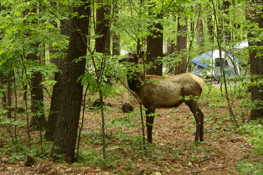 Back at camp we enjoyed the Elk which freely wander among the campsite and lazily sleep in sunny patches in the low-underbrush in the forest surrounding the campers. The tent sites at the back all feature private paths back into the woods, many of which lead to secluded sections of rock outcroppings into the river.