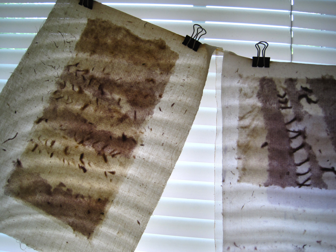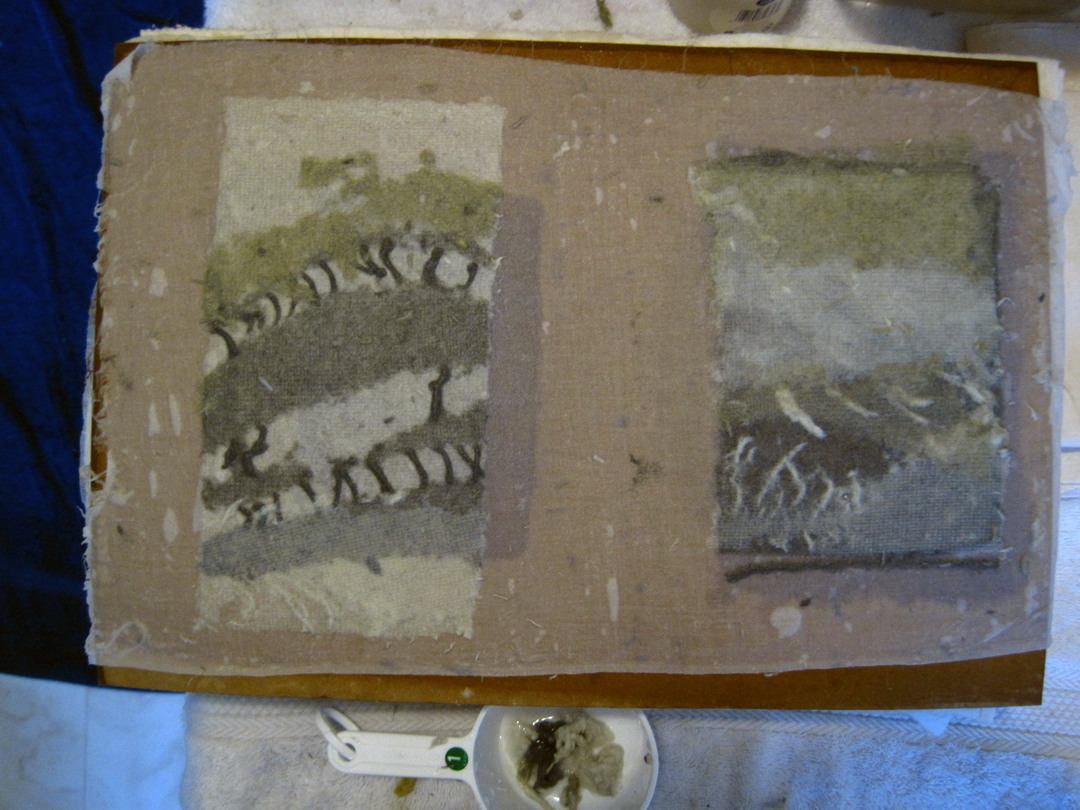 I did run into problems couching my pulled pulp sheets though – I ended up using my dried chip boards again because they created a good seal with the wet cotton sheets I use to transfer my paper. I pulled the pulp sandwich off afterward and put them between my acrylic felts.