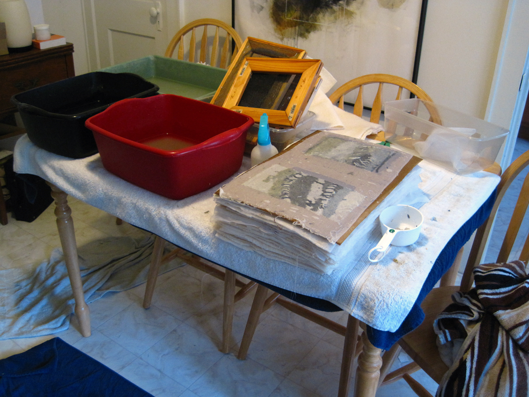 My set up consists of 3 average kitchen tubs collected over the years, 5 screens of various sizes (made using screen stapled to stretcher bars), a stack of couching fabrics and screens, and several towels laid out on the table and floor to catch excess water. This allowed me to have three colors of paper going at any given time.