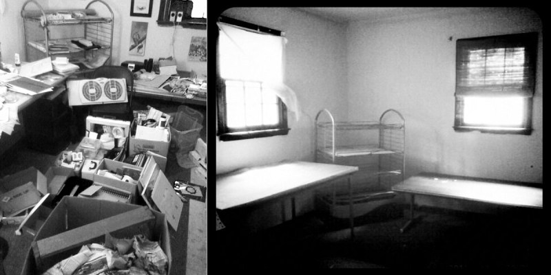 The “cabin” studio before and after the move.