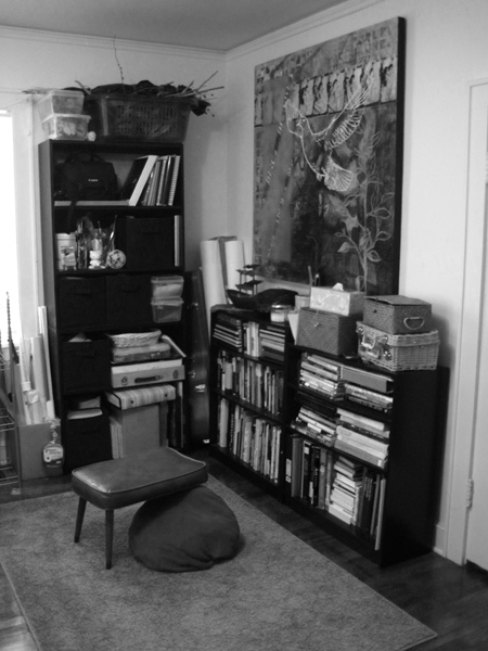 I miss a lot of things about the “cabin” where I’ve had my studio for the last three years while working on my MFA. It was the best space I’ve ever had and, in the past year, it expanded from one room into two. This provided a great deal of groaning when it came time to transform my 2nd bedroom (a.k.a. “the craft/junk/catch-all/cat-fort room”) into an actual workable space.