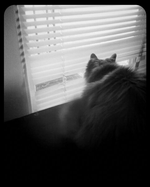 I’ve figured out a few things to distract the little beast from my stacks of paper, tubes of paint, and water jars. As time has gone by my actions are no longer accompanied by the siren song they once were. The most successful solutions have been sitting a stool near the edge of my primary table (where the cats can sit and watch without feeling the need to be on the actual table top) and hanging a bird feeder on the window  near my secondary table (which gives them something more interesting to stare at than me).