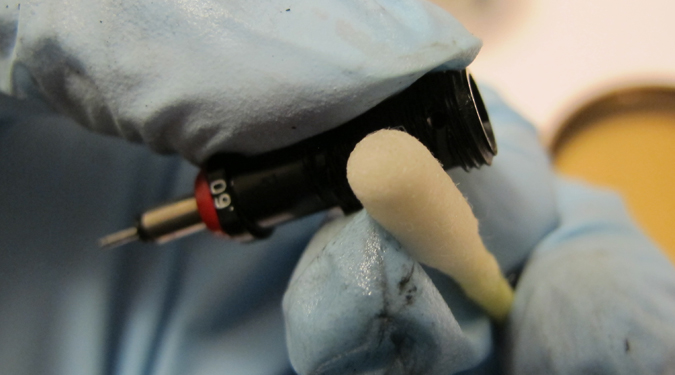 Once it’s really clean, you’ll pull out a q-tip that looks as great as when it went it. Once this happens a couple of q-tips and soaks in a row you know you’re good. By the way – this pen tip part is a bitch because it has threads INSIDE of it which help the ink flow and the the gravity feed to work appropriately. If it’s not clean your pen will not work and will skip and get clogged before you blink.