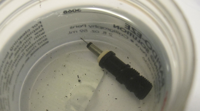 Occasionally you’ll get one of the q-tip ends stuck in the pen tip – you can get them out with tweasers. Be careful to only put in a q-tip that’s already been soaked with alcohol and spin it gently in and out rather than shove it in and out quickly… (that’s what she said).
