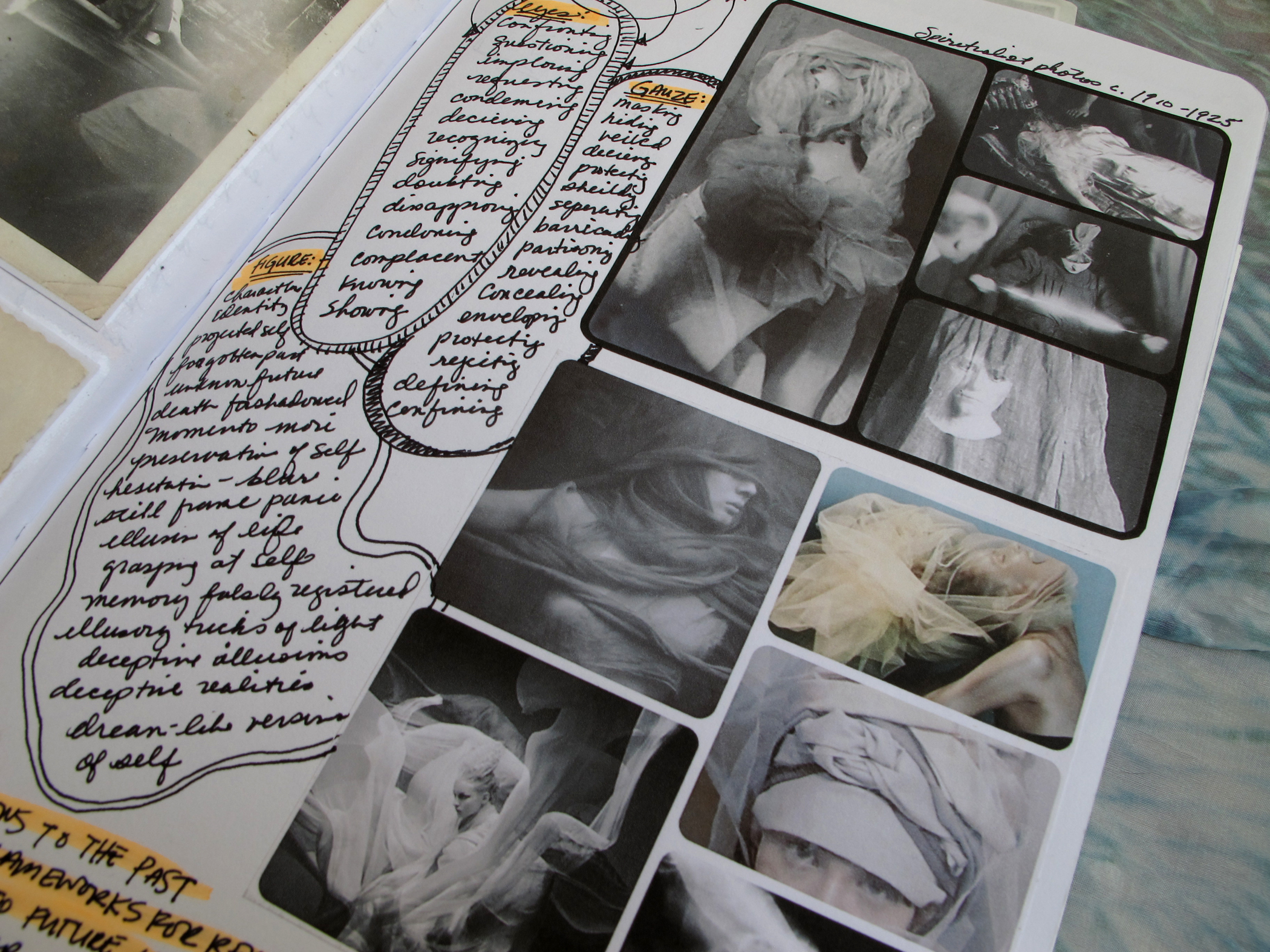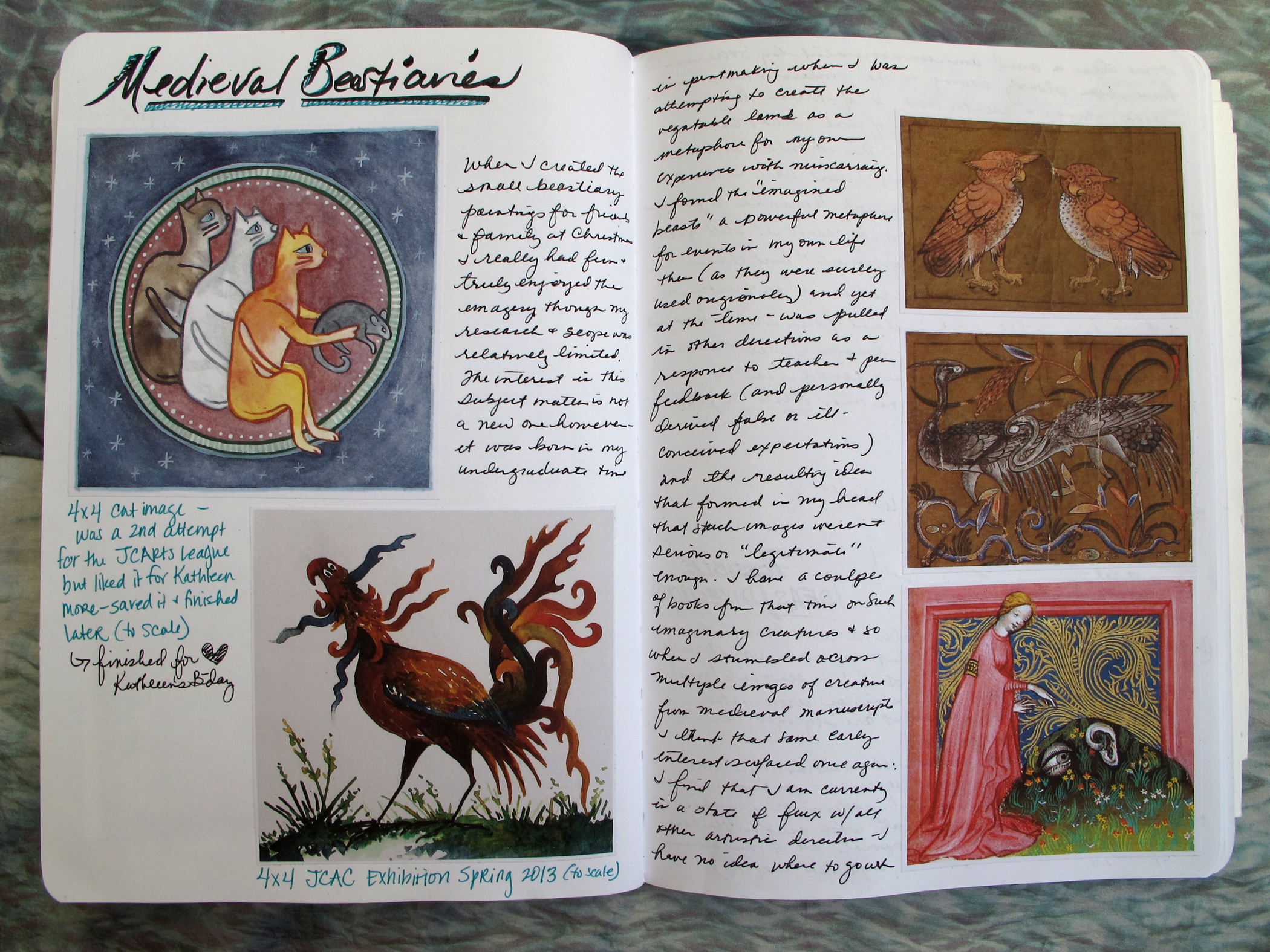 When I start to get near the end of a sketchbook I do two things: I panic a bit and start seeking out a new replacement – I’m very very picky about these things so it takes awhile to find something suitable (does it lay flat, is it leather-free, is the paper just so, etc.) – and I begin to look back through it in its entirety and re-read entries to look for key points and emerging themes.