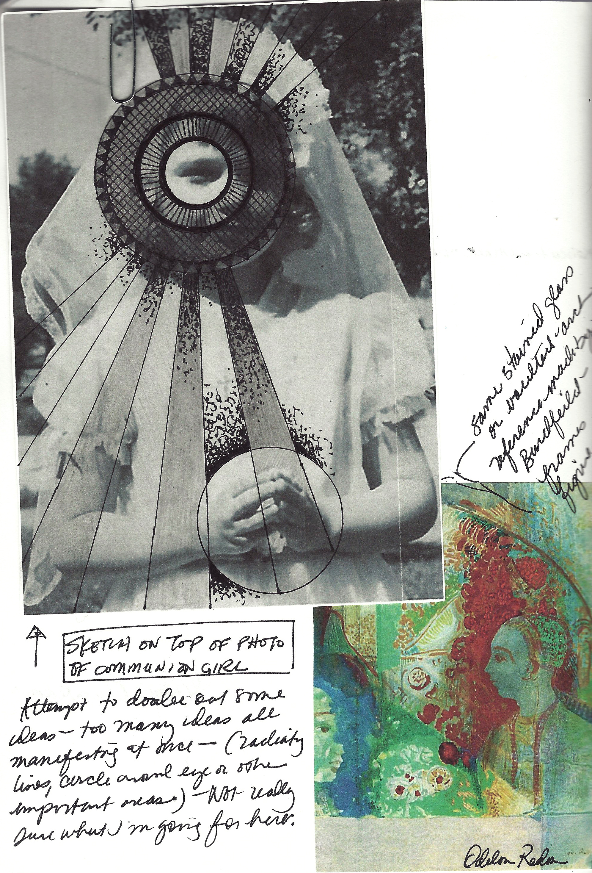 I began to explore the idea of the halo again – something I had done briefly during grad school in the form of “sainted” college students wandering through forests texting and talking on cell phones while being watched by wolves – yep that’s right – this was something I did for a brief time but I somehow ended up with a LOT of work from that couple of months… I haven’t used the halo/saint idea since but it came up again last year fairly strong. Perhaps this is why I was drawn to Nesterov so much – he kind of rocked my world when I found out about him! Same thing with the “Look of Love” pieces.I experimented with various ways of integrating the ideas and visual imagery with some found photos I found at a thrift store last fall but never could get to where I was headed with these. About this time I also started a divergent path with the found photos (which I refer to as the “Spirits Within” work) but that’s for another time.I really worked very little with the found photos in the end – I sort of harped on one picture of a little girl in her first Communion attire and the ideas sort of spiraled elsewhere from there.Part of my hang up with a lot of this stuff is media – I’m not sure what media to work with. I feel restricted by my job and other obligations and so taking on work that is overly complicated or too large feels anything but conducive. I know that to make work at this point I have to do something that I can fit into my life – sad, but true.I particularly love toner – I always have. My instincts tell me that this will feed into the “Spirits” work more than the drawings I’ve been doing as of late.In the vein of Burchfield with his trees that turn in to stained glass and the spiritual symbolism that somehow (despite a conscious awareness or desire to do so) always makes it into my work I’ve found myself enamored with the framework and organization of stained glass and also of art nouveau as a whole.I’ve been working on combining medieval animal illustrations in illuminated manuscripts with botanical illustrations and so far I’m just frustrated. I keep working and I’m finally starting to see some things take shape. The deer above was one of the first studies I created. The drawing below is one of the more recent completed studies that have evolved from this drawing.These types of works are starting to exhibit some of the characteristics I’m going for but I have a long way to go. Currently I’m creating about 3-4 of these 6×8 ink drawings a week and they take about 4 hours a piece. I am feeling more confident with the technical pen (gotta get back in the swing of it after 8 years of not using one) and am beginning to push different aspects to see what takes shape. These are simply studies though I do like some of them for what the are despite the fact that they’re missing the mark. I’ll share more about these in the next post.