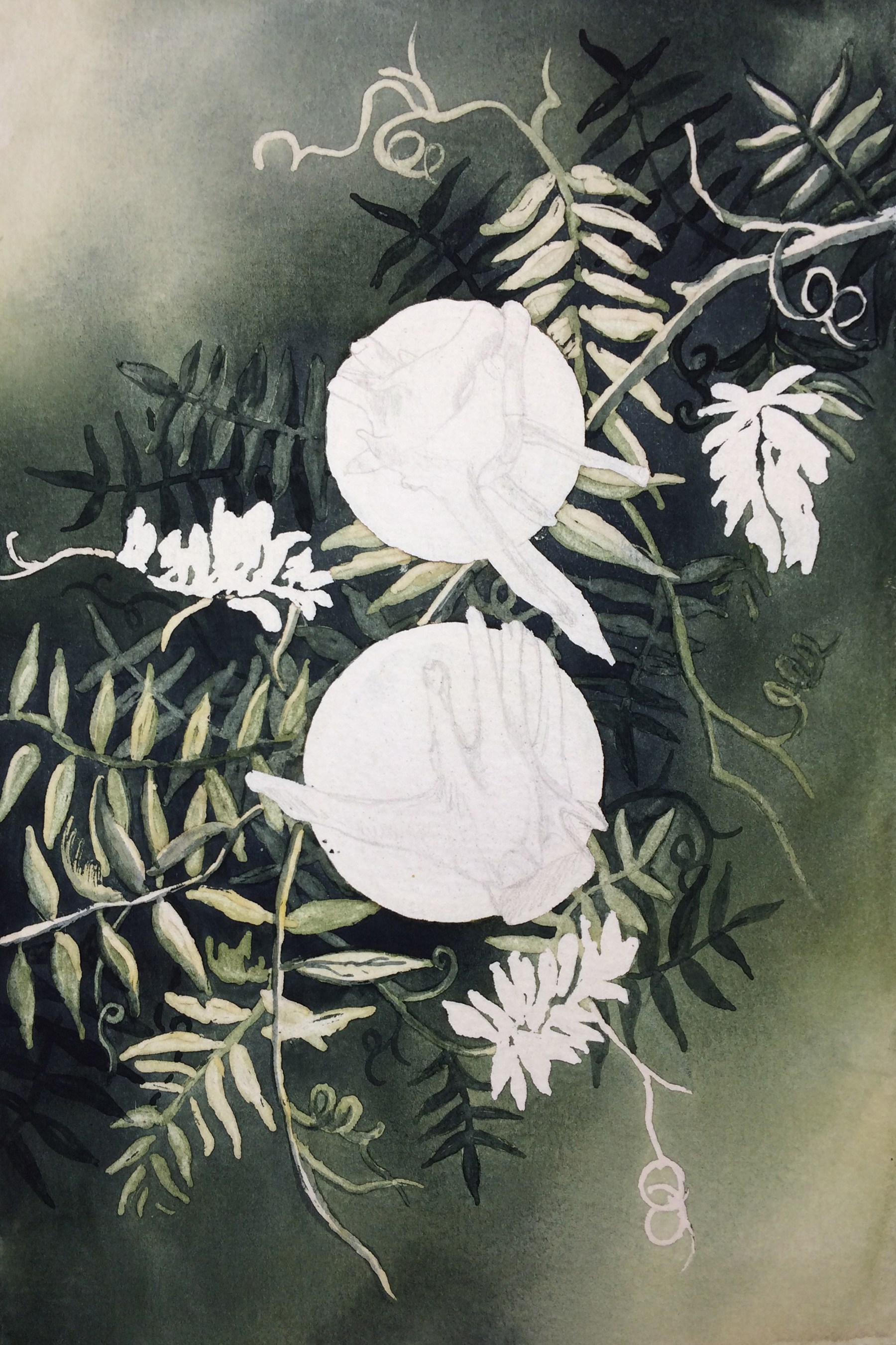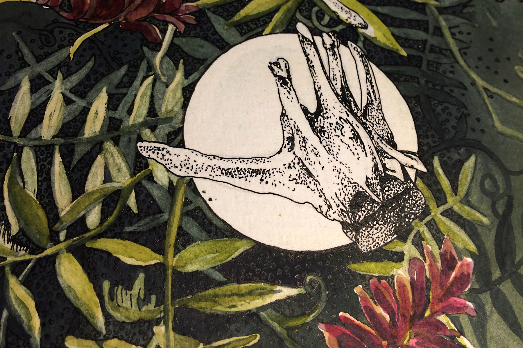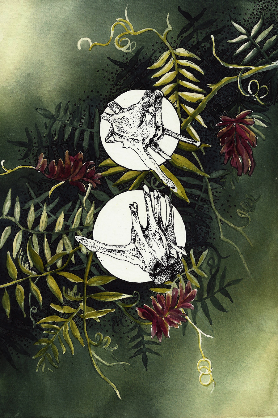 This painting was created with the hopes that I might be able to demonstrate to my watercolor students some of the more expansive practical applications of negative painting and masking but honestly, I also just wanted to make it for myself. I’m really quite happy with the outcome as it finally demonstrates a bit of the “look” I’m going for with a new body of work that centers around animal bones.