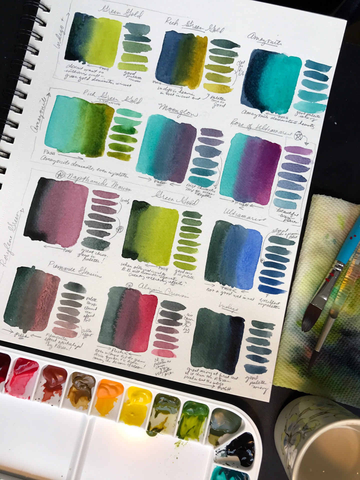 The first thing to look at then, was what types of colors were missing from my range and what new and exciting alternatives are available to potentially replace some of the colors that just aren’t ringing my bell anymore. The tubes that I purchased from Daniel Smith (after testing their 238 sample card in person) helped to fill in some gaps. The new colors I bought are: Green Gold, Rich Green Gold, Mayan Blue Genuine, Amazonite Genuine, Rose of Ultramarine, Napthol Maroon, Red Fuschite Genuine, and Quinocridone Coral (seen below). In the past two years I’d also picked up some novelty effect tubes like Lunar Black, Moonglow, Cascade Green, and Iridescent Red Scarab, as well as the more integral Perylene Green and Piemonite Genuine.