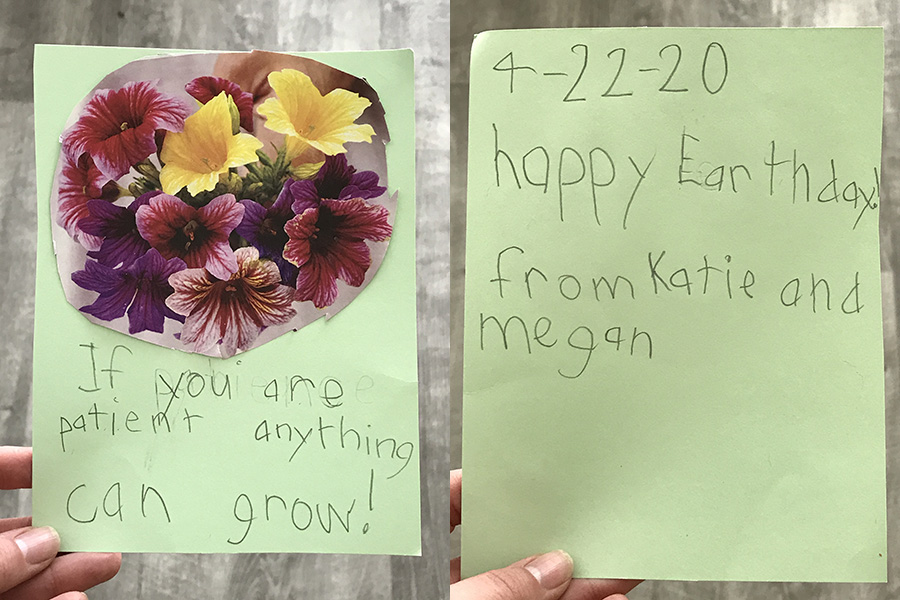 Katie is great with scissors – she has had a lot of practice and has followed in my footsteps with a love of cut paper. However, she found that it was hard to work with the images “as texture or color” rather than as what they depicted. She created an Earth Day card for her auntie instead with these cut outs (and she totally came up with what it said entirely on her own!).