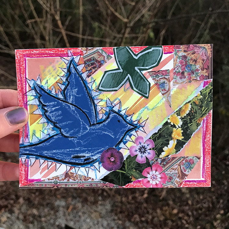 And now that the holidays are over and the kiddo is back in school part time I find myself continuing to make pandemic postcards – although this time I am doing them largely on my own. I’ve started too integrate more cut paper and foliage into the mix and I really like the direction these are taking.