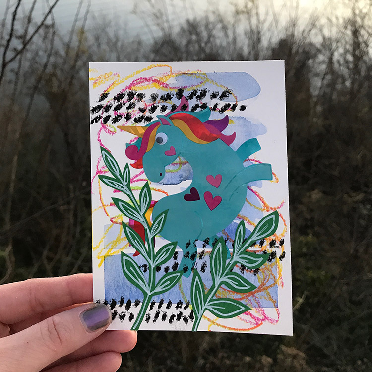 Katie took the lead on this unicorn themed postcard using a giant sticker.