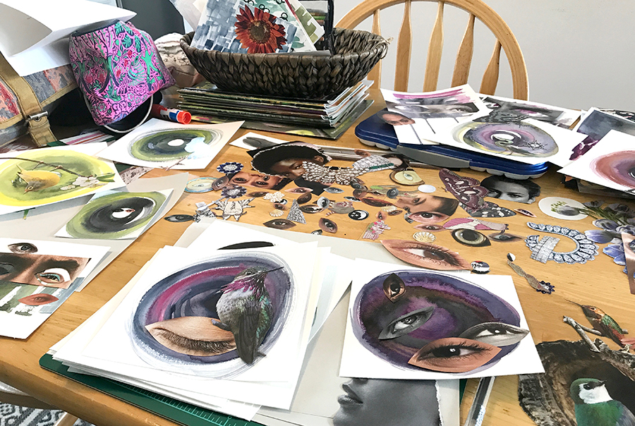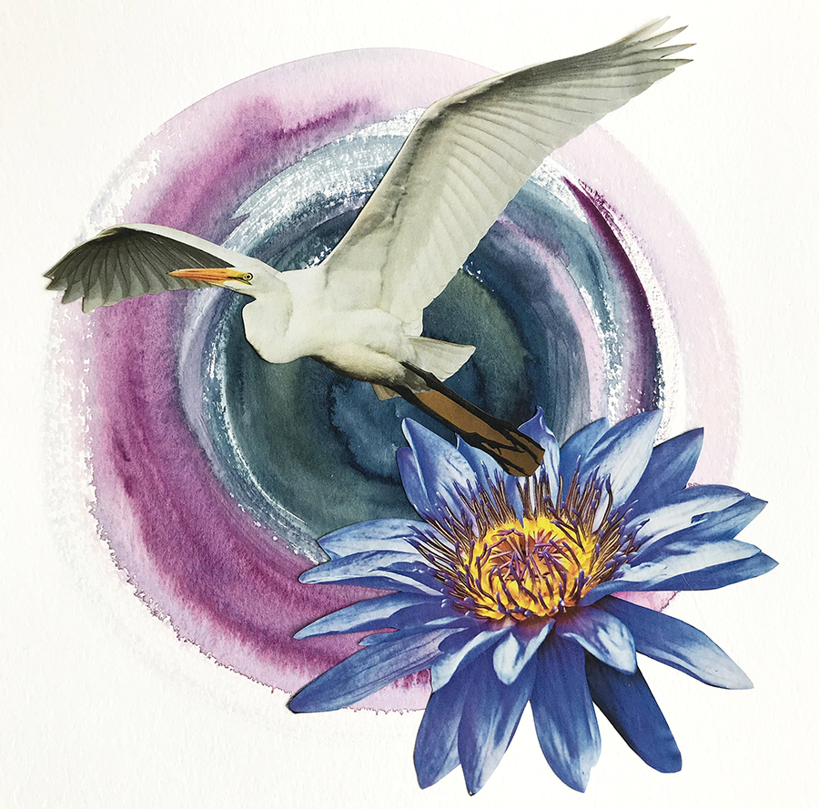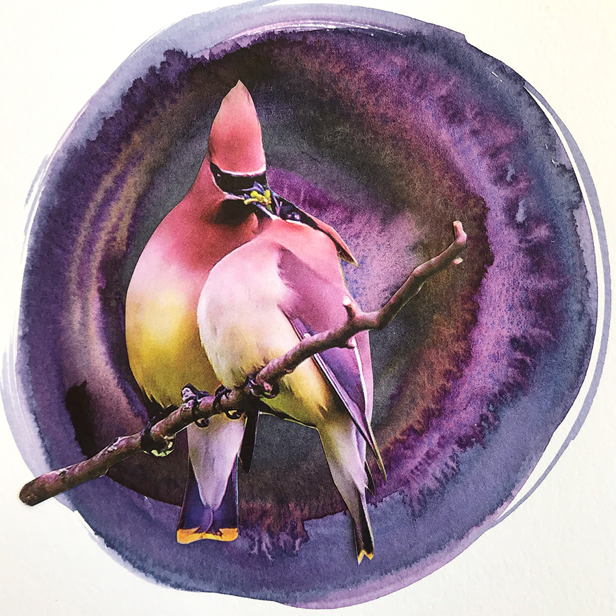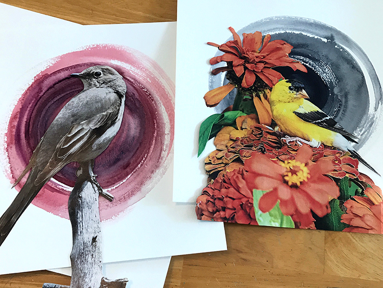 Shortly after completing the first round of Pandemic Postcards with my daughter I felt the impulse to play with collage media thanks to a (sadly unfamiliar at the time) burst of inspiration. I began to explore the combination of simplified watercolor compositions consisting of meditatively created gestural circles and found imagery via old issues of “Birds and Blooms Magazine” and other assorted magazines purchased at the local library’s book sales.