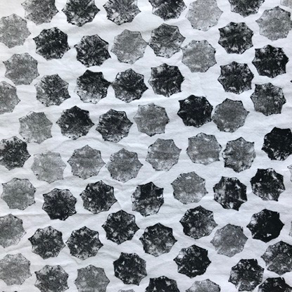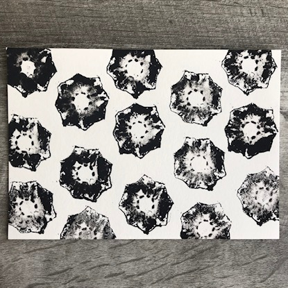 Not all surfaces held the detail of the cactus slice in the same way. I found that a very soft printmaking paper (unknown type) was the most effective at retaining the details. Fabric allowed the moisture in the cactus to soak in and blur the ink before it dried, leaving less detail overall.