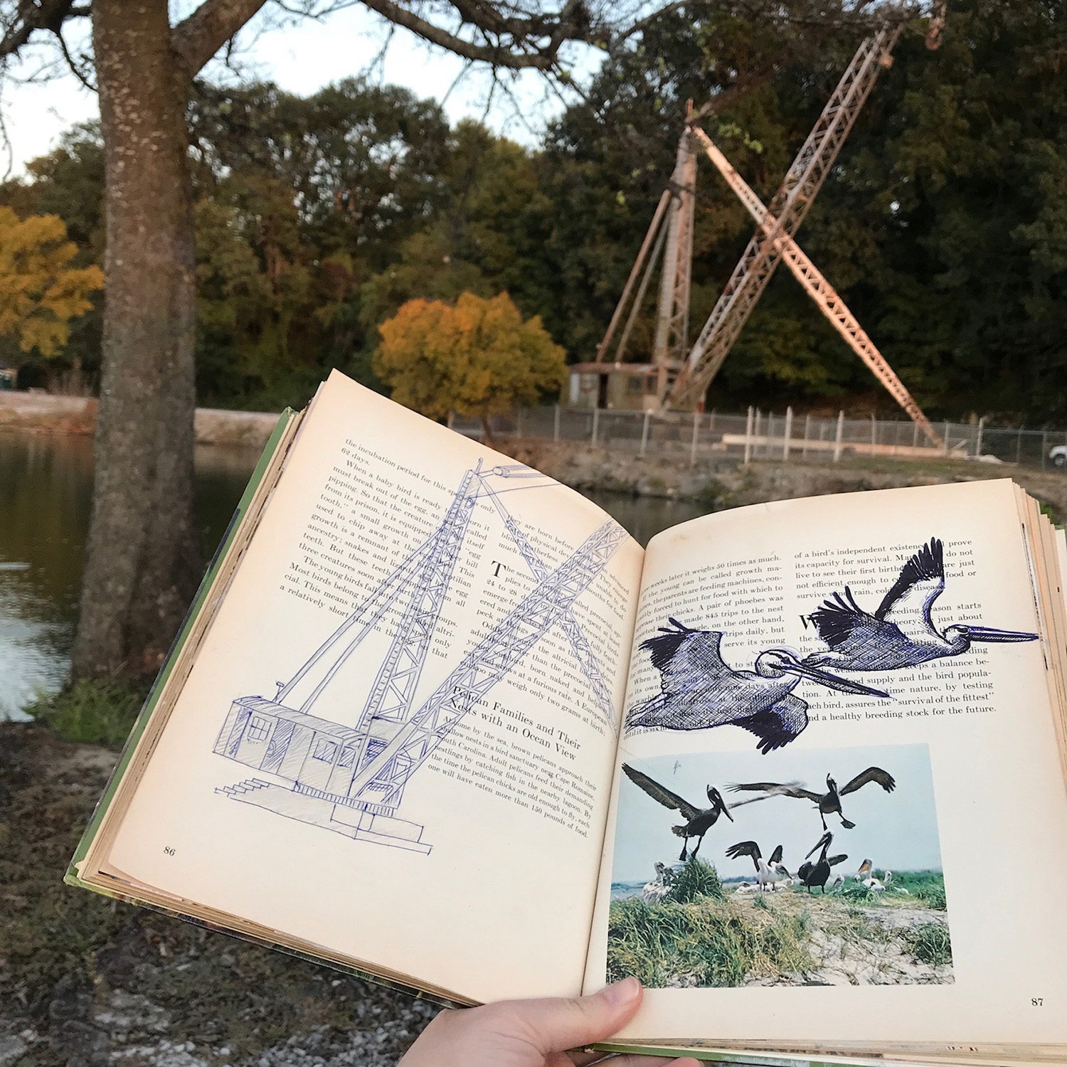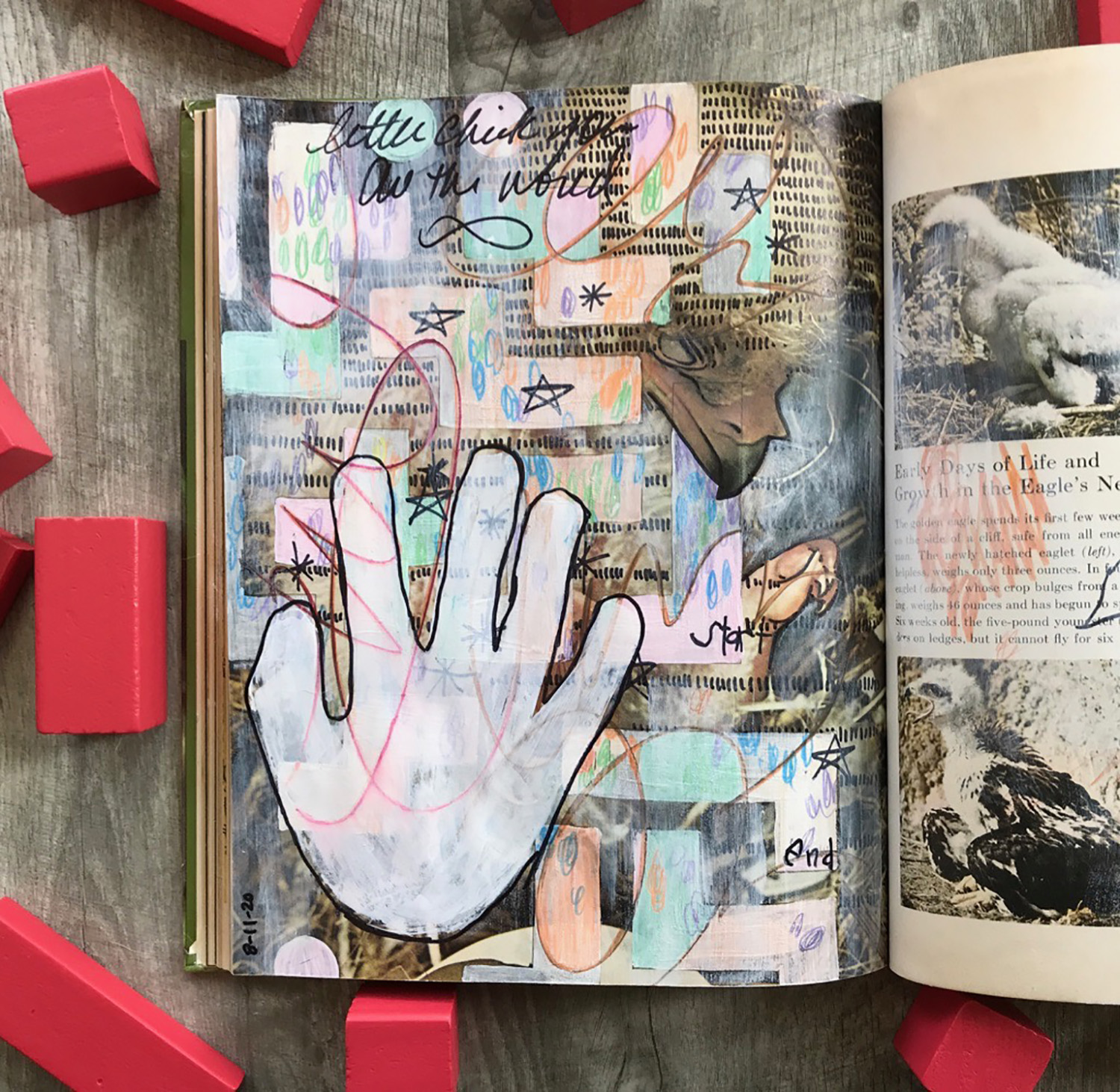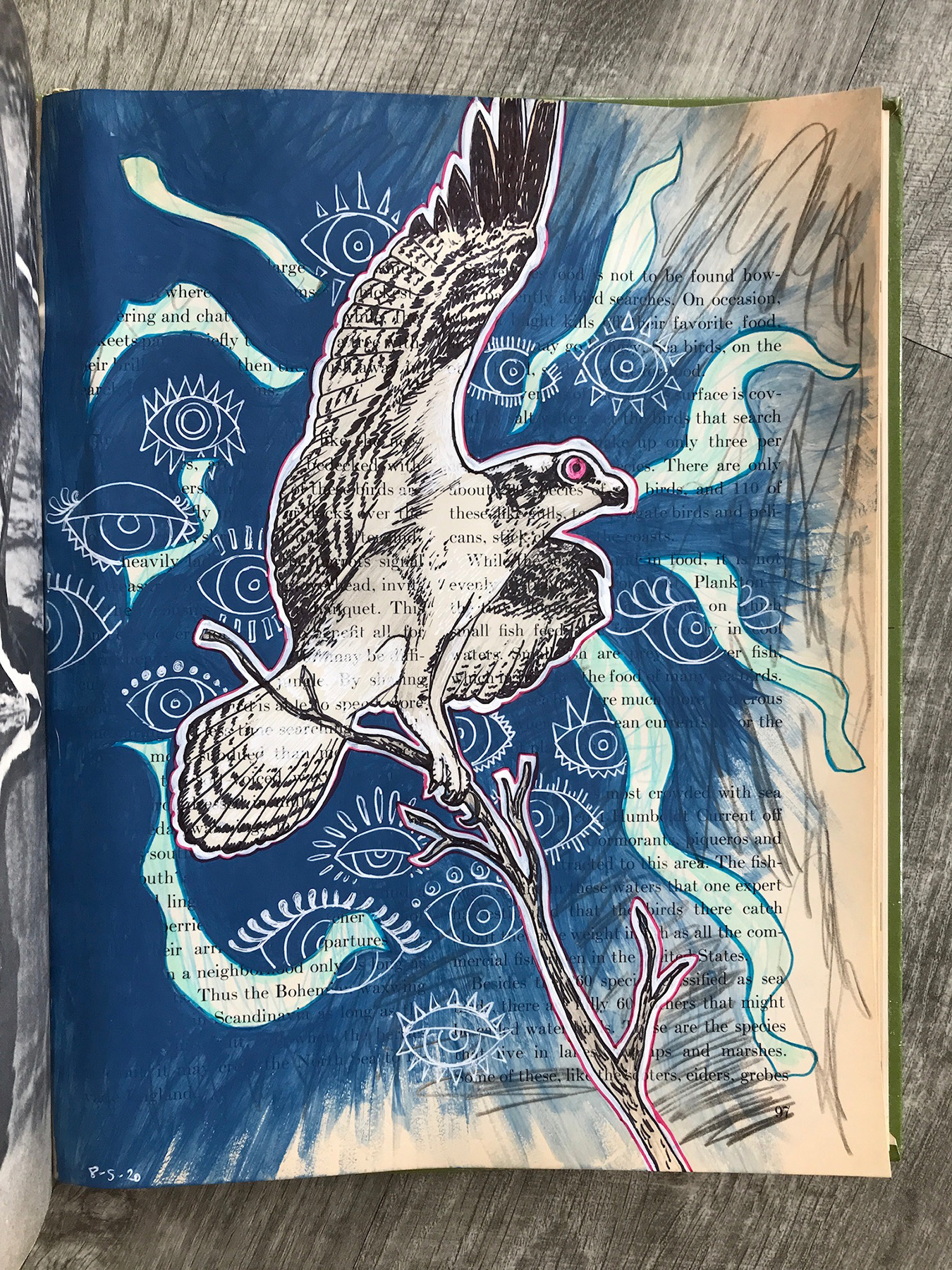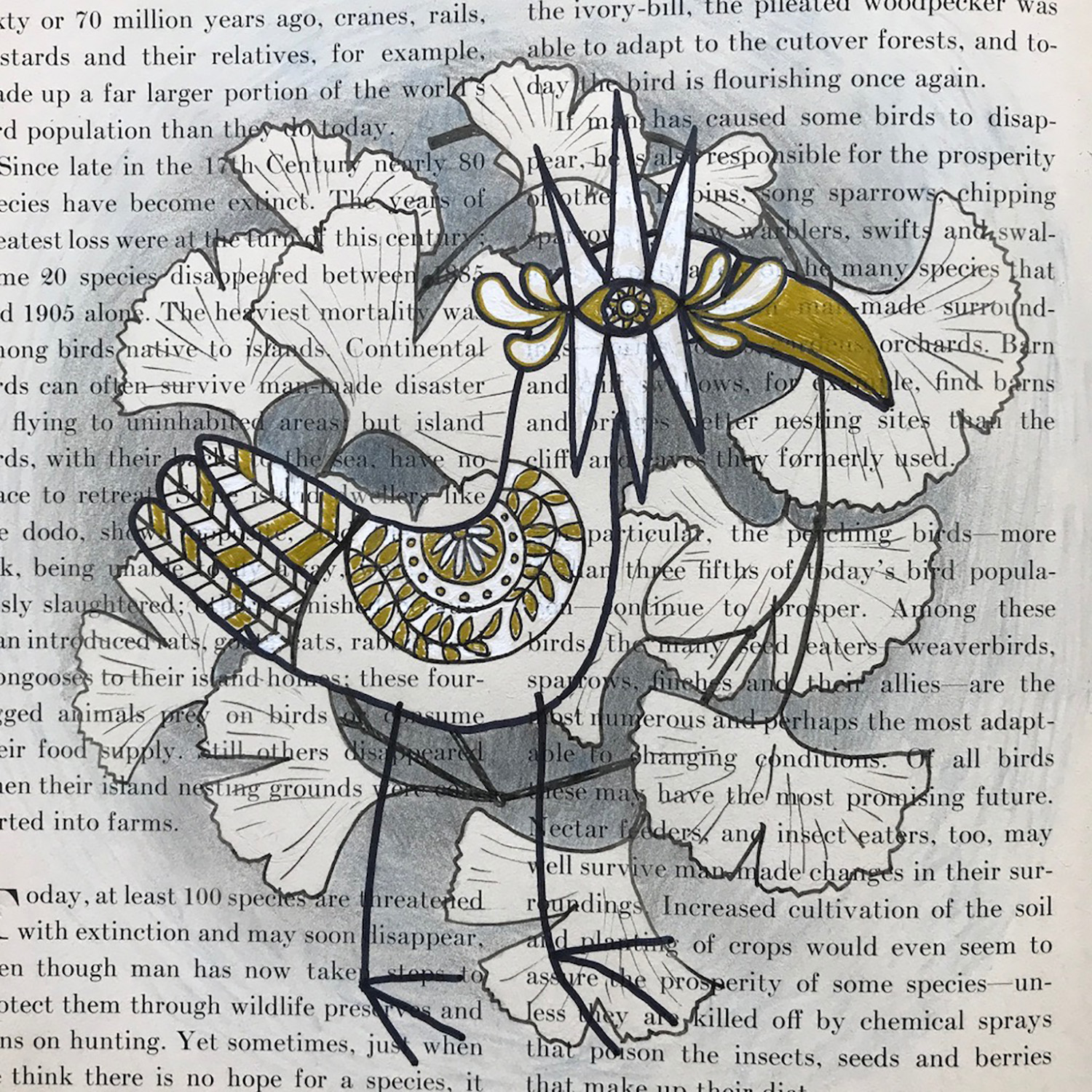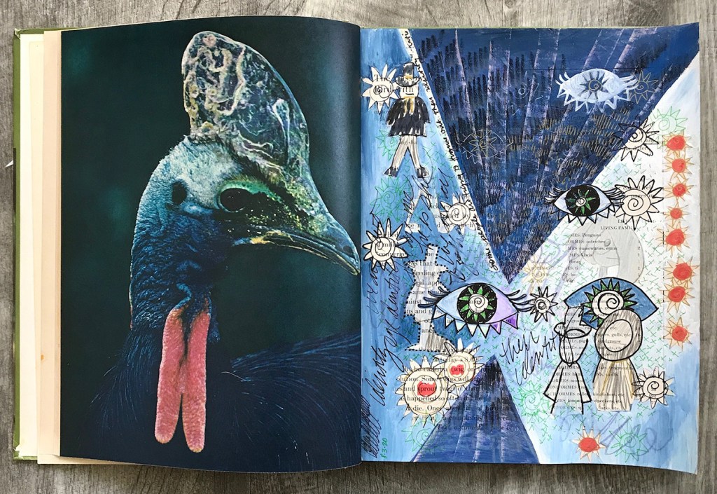Katie chose a vintage book on birds as my muse but it turns out it was her muse as well because it quickly became evident that she wanted to participate. As I was always searching for ways to integrate her into my studio practice to make these efforts more accommodating I immediately acquiesced and invited her to work directly with me to create imagery.