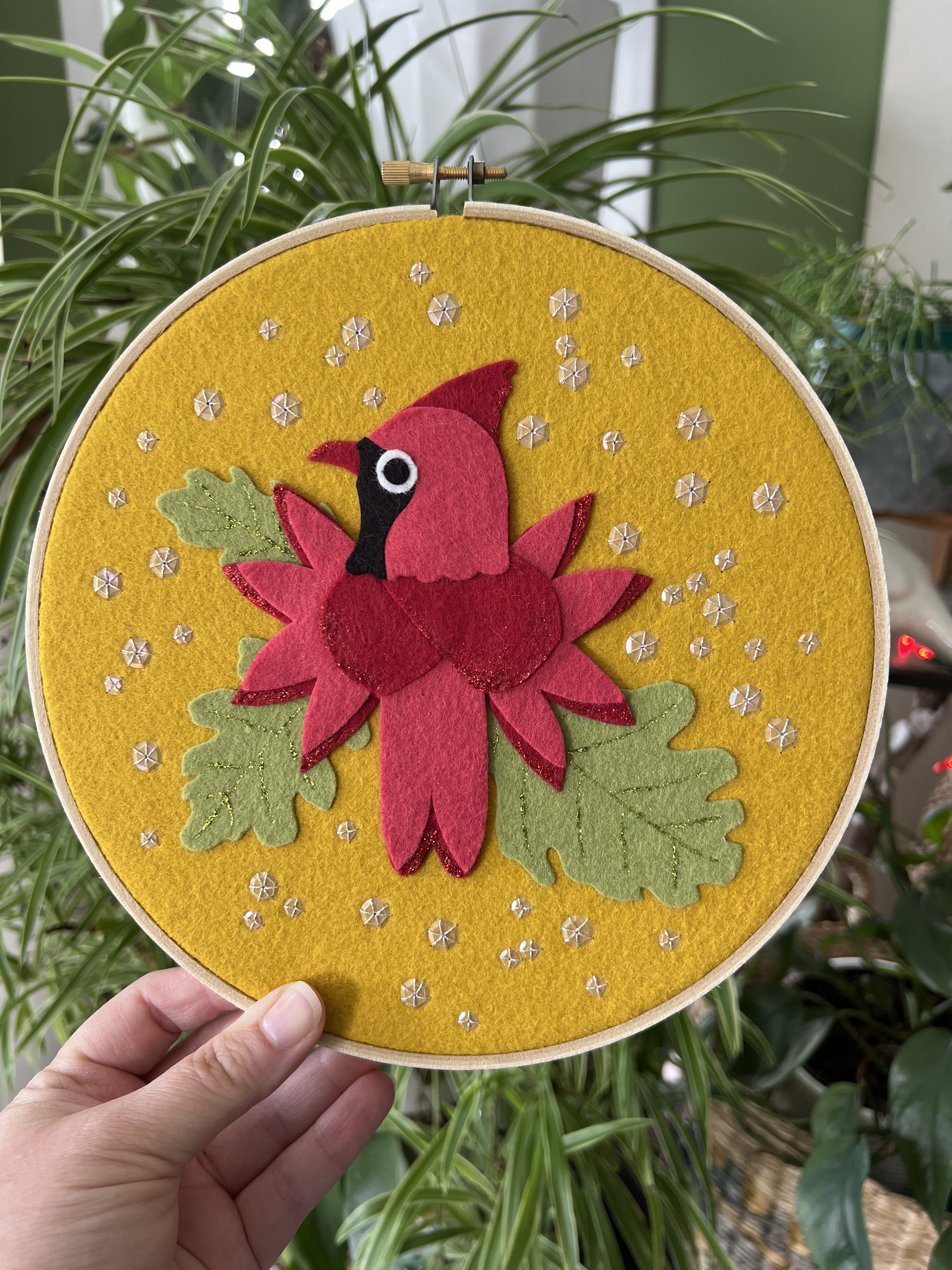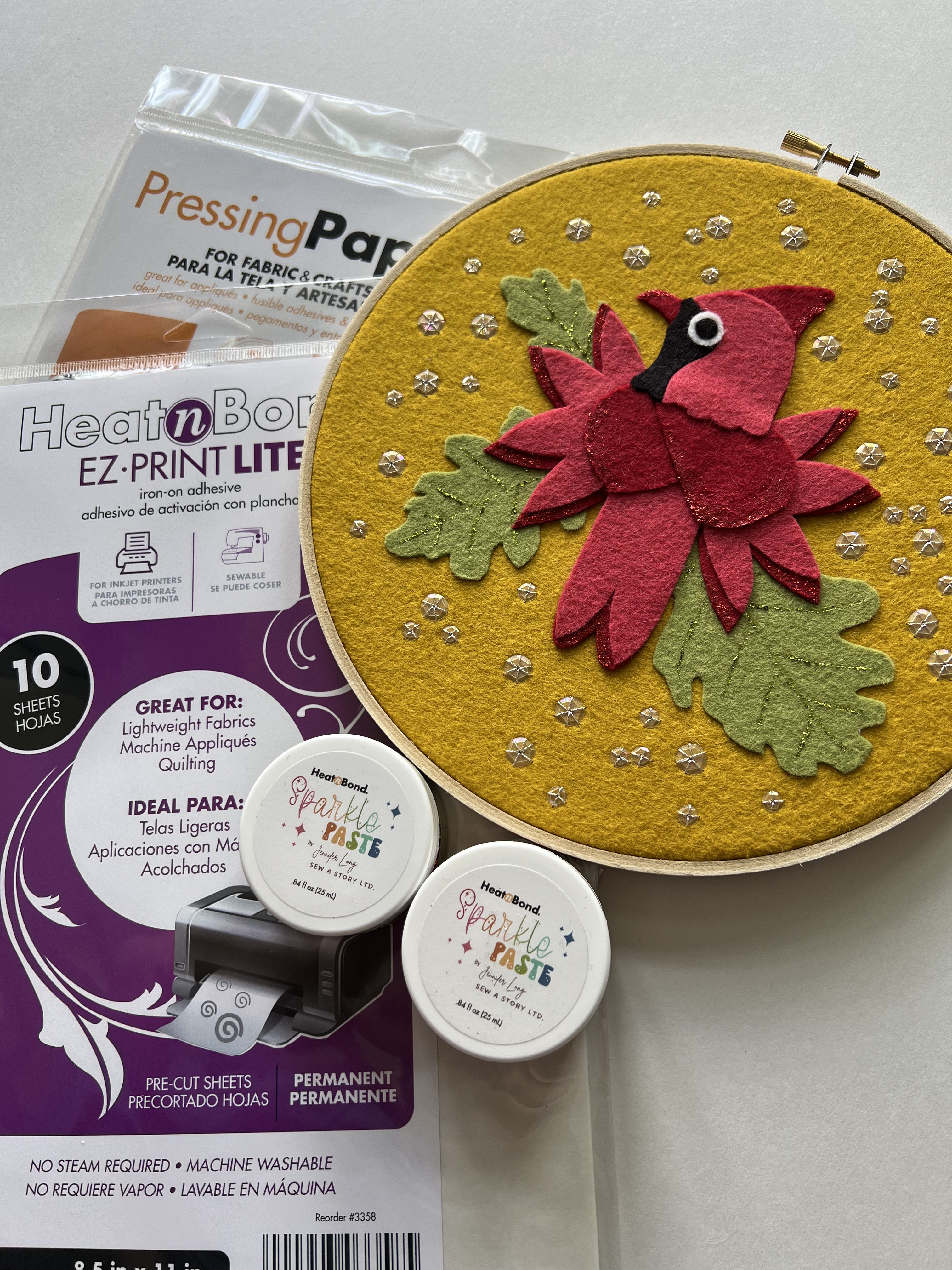 In July, Benzie shared a bunch of holiday themed patterns, including my Winter Wishes Cardinal hoop pattern that uses ThermoWeb products to make completion a breeze.