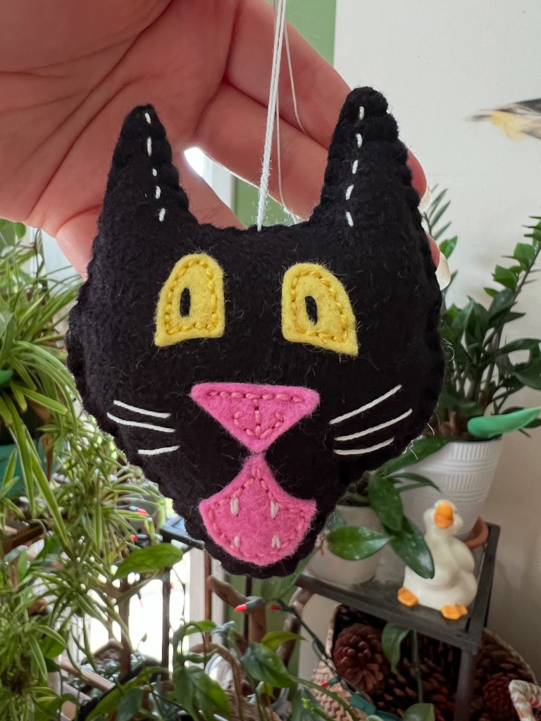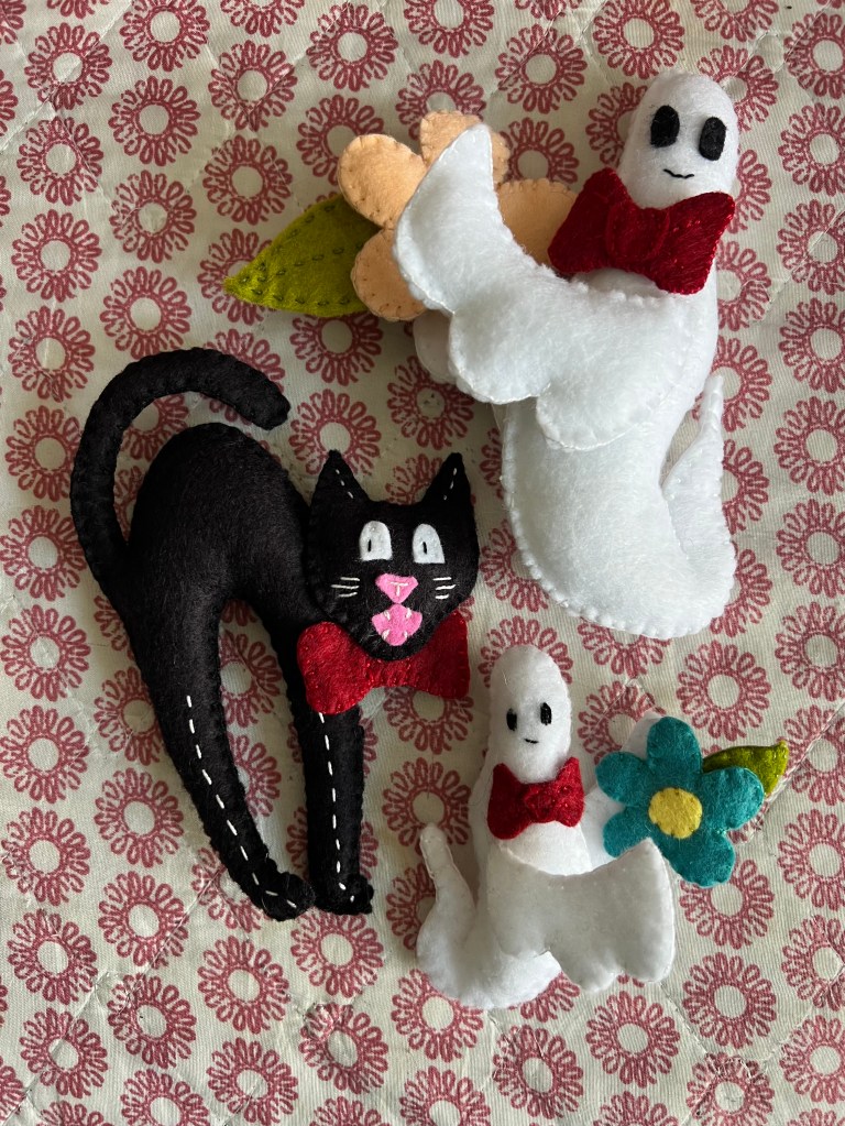 I designed a cute ghosty and a scaredy cat for the spooky holiday season this year and sent them straight to the shop where I sell some of my work in East Tennessee. I had to employ some tricks – like placing pipe cleaner in the tail of the cat – but ended up with quite a treat for a final product. I was greatly inspired by vintage ghost and cat imagery, particularly those containing bows!