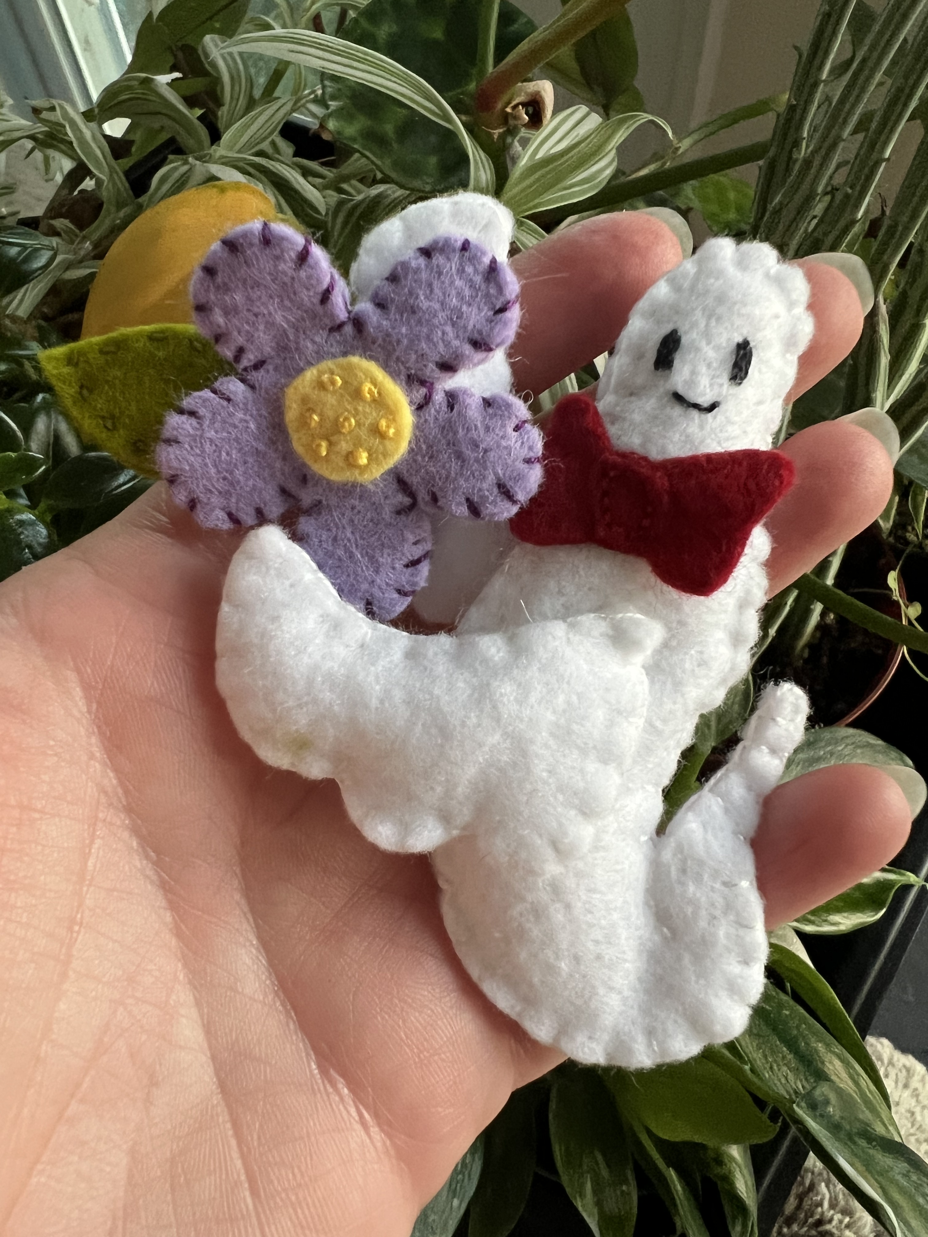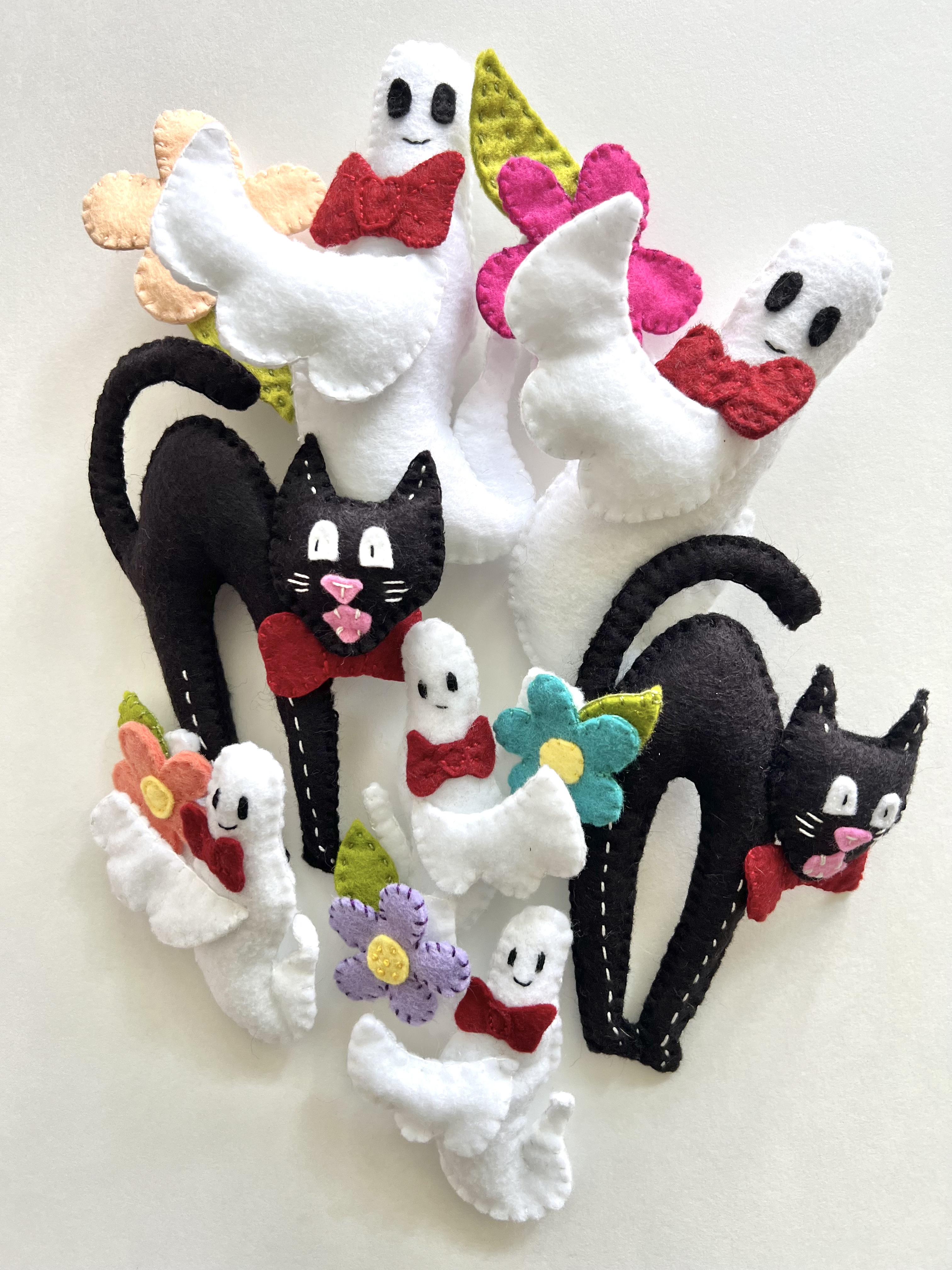 I designed a cute ghosty and a scaredy cat for the spooky holiday season this year and sent them straight to the shop where I sell some of my work in East Tennessee. I had to employ some tricks – like placing pipe cleaner in the tail of the cat – but ended up with quite a treat for a final product. I was greatly inspired by vintage ghost and cat imagery, particularly those containing bows!