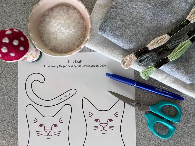 On the Benzie site you’ll find step-by-step instructions, a supply list, and a downloadable PDF with two different cat patterns on it – one cat is tall and skinny the other is short and squat. This pattern should be available throughout 2026.